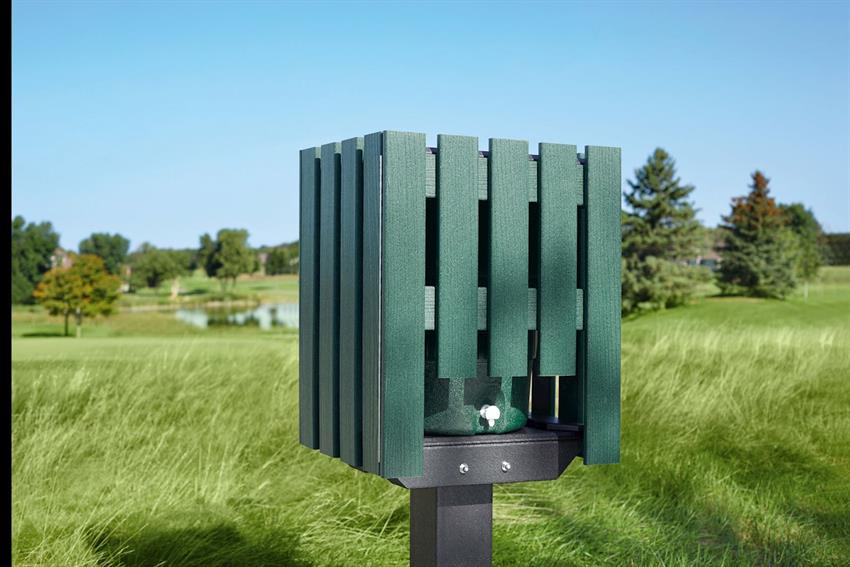 The Water Pro Jr. has a locking door with front access and is constructed from 100% recycled plastic material. Mounting post in 6-inch by 6-inch by 72-inch and can be conveniently located virtually anywhere on the course.